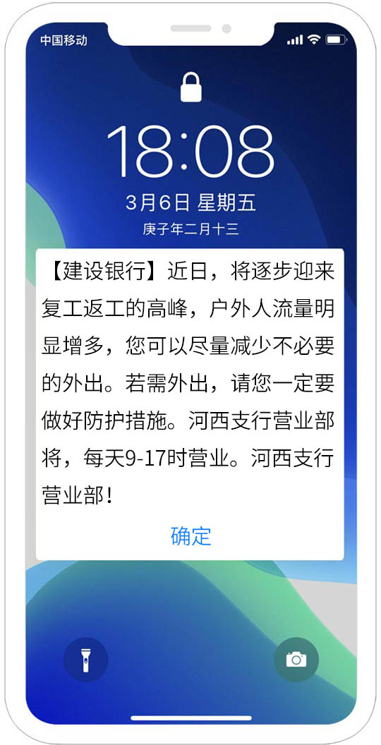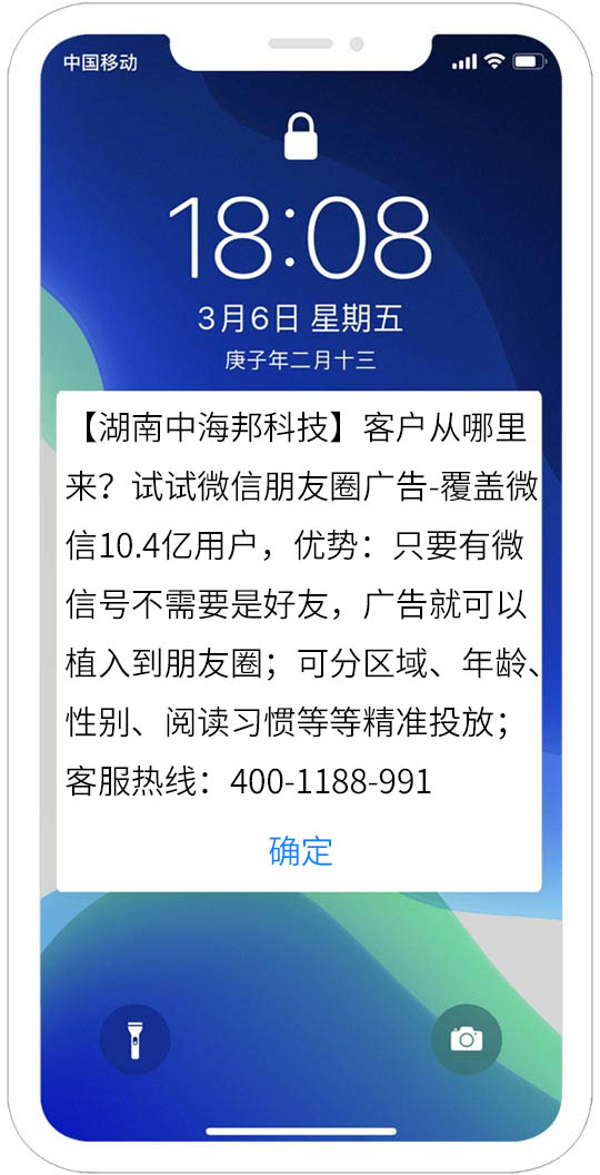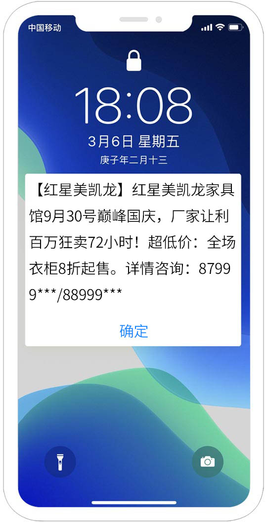 是指用戶在收到閃信群發(fā)內(nèi)容后,無需打開,短信內(nèi)容直接顯示在用戶手機(jī)屏幕上,用戶如果沒有點(diǎn)擊閱讀,則閃信內(nèi)容一直有顯示,用戶必須點(diǎn)擊才能關(guān)閉,真正實(shí)現(xiàn)了高閱讀率、高到達(dá)率!提升了用戶對產(chǎn)品的轉(zhuǎn)化率!