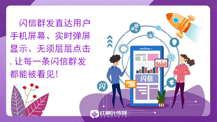 紅楓葉閃信群發(fā)79元起充、每條僅需幾分錢、高性價(jià)比、按需付費(fèi)、24小時(shí)發(fā)送、快速實(shí)現(xiàn)商用。未來已來,紅楓葉閃信群發(fā)業(yè)務(wù)喚醒商機(jī),讓閃信群發(fā)帶著品牌飛,紅楓葉閃信群發(fā)平臺、海量名企的選擇,十年通信技術(shù)服務(wù)及經(jīng)驗(yàn),無延時(shí),秒級觸達(dá),99%以上閃信5秒內(nèi)觸達(dá),閃信群發(fā)平臺紅楓葉傳媒